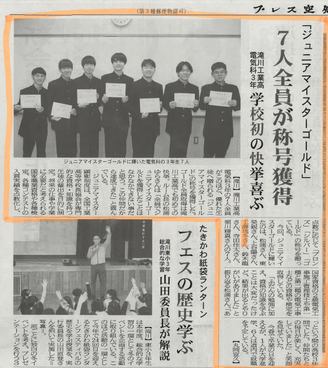 プレス空知2026年1月31日付の紙面にて、滝川工業高校の電気科3年生7名が